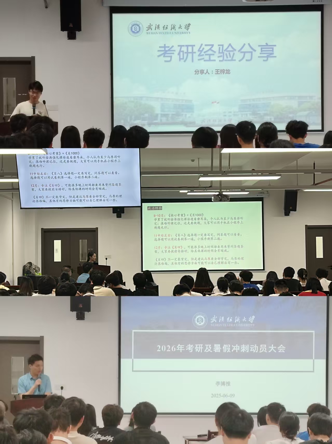 活动还邀请了2022届员工李博惟、2025届毕业生王梓龙、邓心悦分别就考研信息收集、考试科目选择、备考计划制定、备考心态调试等方面来提供了系统指导和给于了合理化的建议。最后,员工也就自己关心的考研问题进行了提问,参会老师和优秀员工代表进行了答疑。与会同学纷纷表示要向优秀学长们学习,坚定考研信心,做好时间规划,安排好复习节奏,坚持到底,一战成硕。