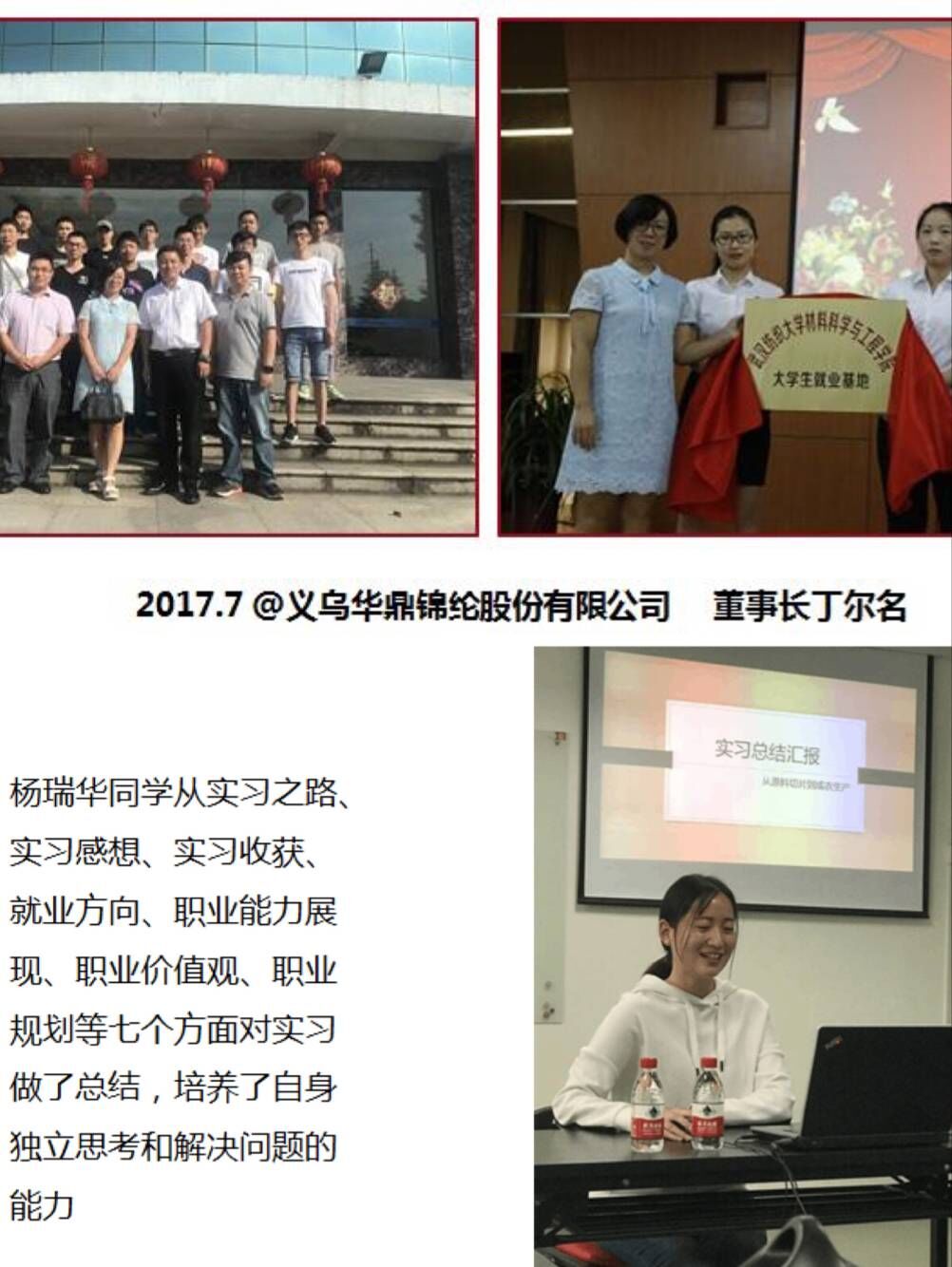 (四)依托实习实践平台,引导员工做好人生规划,提升员工的职业规划能力和职业素养。公司在加强毕业生就业创业指导上下足了功夫。一方面将优秀企业“请进来”举办高管报告会及招聘会,一方面积极搭建就业创业平台,与地方企业如李宁公司等建设校企联合培养计划,安排员工“走出去”亲密接触企业,并定期进行企业回访。