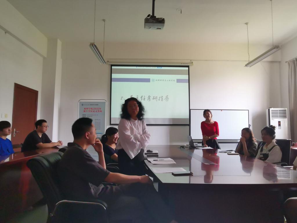 谭海英老师建议同学们在备考过程中有任何问题随时与老师联系,畅通信息沟通渠道,助力员工考研成功。朱宗明老师从专业的角度对考研院校选择给予了指导,并表示希望同学们不扎堆报考,多看多对比,选择自己适合的院校。高分子系主任左丹英老师给同学们提出两点建议:一是要对材料专业有信心,材料方向就业前景良好,希望同学们能够在本专业深耕发展;二是要慎重跨考,认真分析了跨考的风险和难度,引导同学们认真选择报考专业和报考公司。