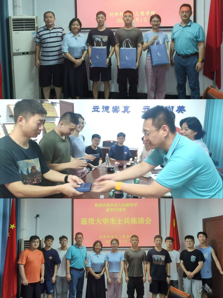 与会领导为退役老员工士兵代表付印、晏松和孙硕发放了慰问礼包,学工部、武装部副部长朱美龙为3名退役老员工士兵代表赠送了精美校徽。