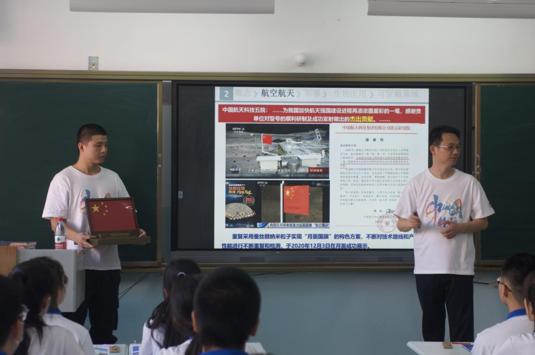 (殷先泽教授为大家做科普报告,现场展示“月面国旗”)