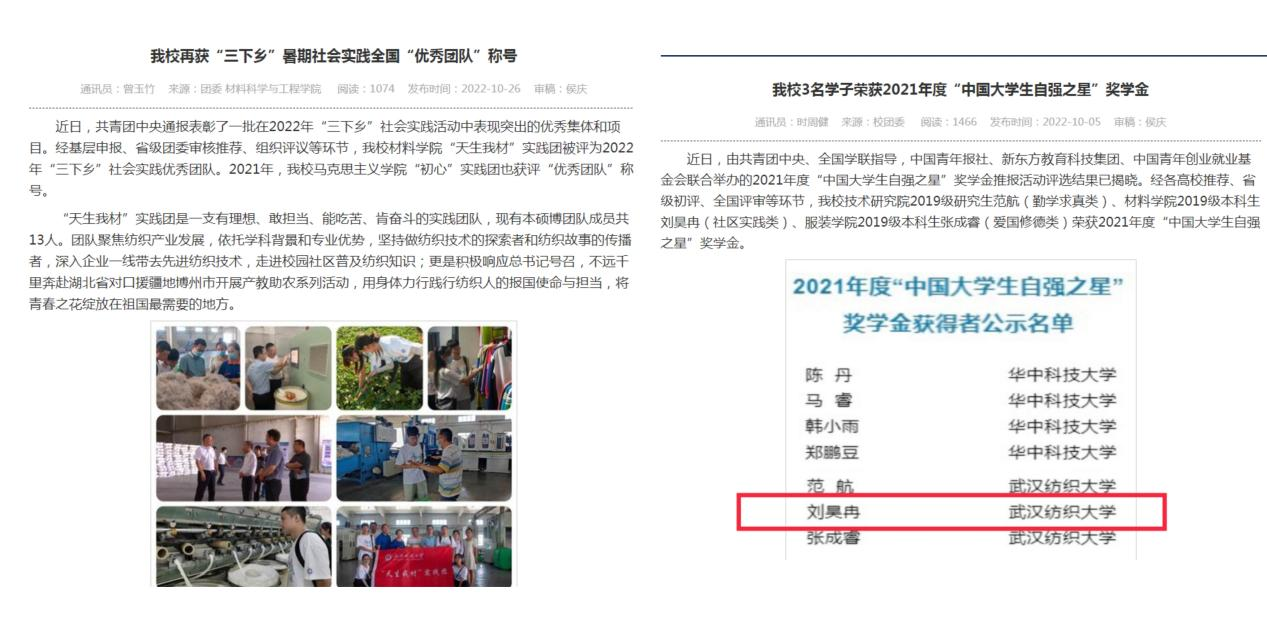 公司“天生我材”实践团荣获团中央2022年全国“三下乡”社会实践活动“优秀团队”称号。高分子11902班刘昊冉荣获2021年度“中国老员工自强之星”。