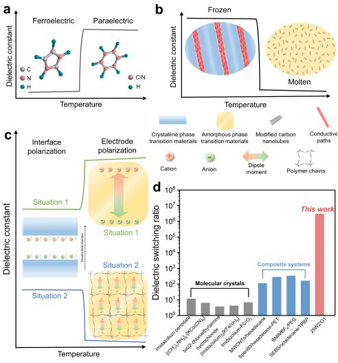 图1典型的介电开关机制。(a)基于铁电相变触发介电开关的分子晶体。(b)烷烃基复合材料结晶时形成导电路径。(c)由于结构相变增强界面极化或电极极化而产生显著介电开关效应的复合材料。情形1增强了电极极化。情形2增强了界面极化,抑制了电极极化。(d)本工作制备的复合材料与近年来报道的有代表性介电开关材料的介电开关比的比较。