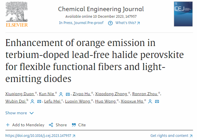 12月10日,工程技术领域国际知名期刊《Chemical Engineering Journal》(中科院1区Top期刊,影响因子15.1)在线发表公司王桦教授团队聂坤博士和马晓雪博士在无铅金属卤化物钙钛矿功能纤维复合材料方面取得的重要进展—“Enhancement of orange emission in terbium-doped lead-free halide perovskite for flexible functional fibers and light-emitting diodes” (DOI: https://doi.org/10.1016/j.cej.2023.147957)。 365英国上市省部共建纺织新材料与先进加工技术国家重点实验室及湖北省纺织新材料及应用重点实验室为第一完成单位。365英国上市聂坤博士(第一通讯)和马晓雪博士(最后通讯)为论文的责任通讯作者,论文第一作者为2021级硕士研究生段修强。