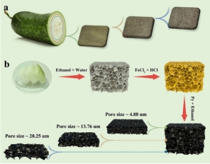 低能耗淡水制备一直是国际前沿研究课题。近年来,人口增长、污水排放及碳中和等问题,将该研究方向进一步推向了热潮。太阳能光热界面水蒸发技术利用清洁、无污染、可再生的太阳辐射进行水体加热蒸发,从技术理论上可以获取充足、稳定的优质水,并且符合节能减排和可持续发展的要求,是制备淡水最理想的方式。但基于目前技术革新所实现的淡水制备通常面临高输水通量与有效热管理相互制约的难题。如何平衡输水通量与热管理,最终实现高效界面水蒸发是当前的挑战之一。基于此,该工作首次以仿生的方法制备了一种具有特殊梯度孔结构的三维材料。此三维材料上表面平均孔径约为4.88 um, 底部平均孔径约为20.25 um,沿此方向具有明显的孔尺寸梯度。由于其特殊的梯度孔结构,导致材料沿孔尺寸增大方向的吸光性逐渐减弱,吸水性逐渐增强,润湿状态下材料的隔热性逐渐降低,此特殊性质能够极好的解决光热材料水传输与热管理之间的问题。在1 kW m-2的模拟光照强度下,测试其光热水蒸发速率高达2.49 kg m-2 h-1,光热水蒸发效率约为96.3%,并且,利用所制备的蒸发器对多种非饮用水进行纯化之后,处理后的水质具有明显提高。