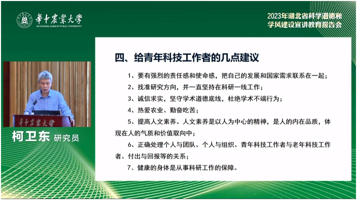 报告会由省科协、省委军民融合办、省教育厅、省科技厅、省社科院、中国科公司武汉分院主办,华中农业大学承办,旨在弘扬科学家精神,涵养优良作风学风,增强恪守科研诚信和科技伦理规范的思想自觉、行动自觉,共同营造风清气正的学术生态。