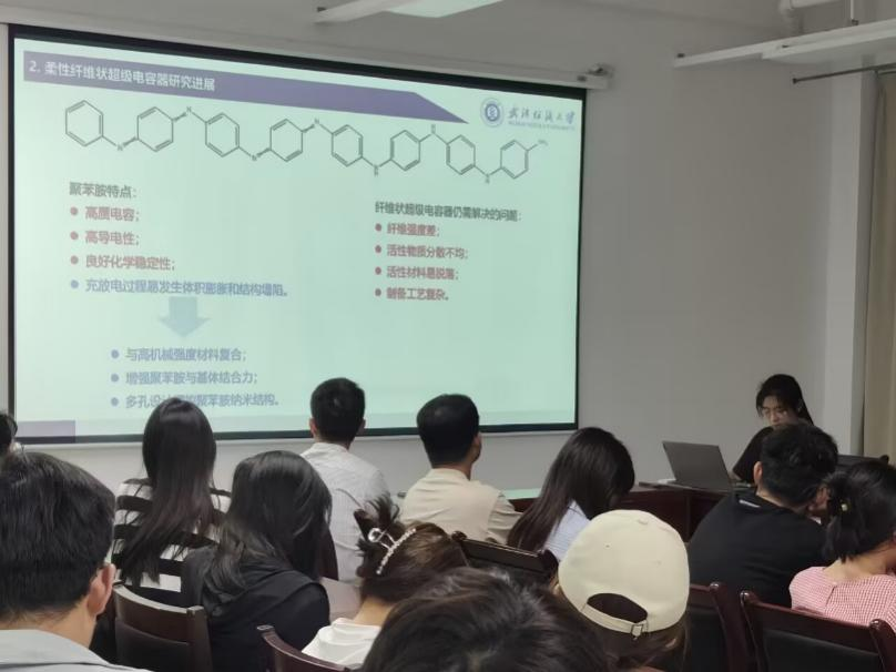 梅尹同学则围绕《聚氨酯基柔性纤维电极的制备及其电化学性能研究》进行汇报,该研究基于非溶剂诱导相分离法,以聚氨酯为柔性基体,结合多种材料特性构建多维离子传输通道。制备的纤维电极材料机械性能与电化学性能良好,其中 PU - PANI - CNT10wt% 纤维在电流密度为 20mA/cm³ 时,体积比电容表现出色,且所制备的对称超级电容器具有较高的功率密度和能量密度,能承受多次弯曲变形,为可穿戴电子设备提供了优良的电化,性能保障。