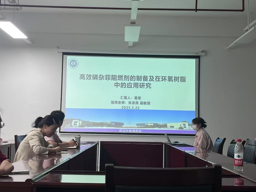 葛慧同学以《高效磷杂菲阻燃剂的制备及在环氧树脂中的应用研究》为题进行汇报。主要研究高效磷杂菲阻燃剂的制备及其在环氧树脂(EP)中的应用。阻燃剂添加法因工艺简单、成本低等优点被广泛研究,尤其是DOPO基无卤阻燃剂。研究通过实验设计合成了磷杂菲阻燃剂PDA,并通过红外、核磁等手段确认其结构。热稳定性测试表明,PDA的加入降低了EP的热稳定性,但提高了残碳率。阻燃性能分析显示,添加PDA显著降低了EP的热释放速率和总热释放量。SEM和拉曼分析表明,PDA使EP残碳更致密。力学性能测试发现,PDA的加入改善了EP的力学性能,但过量PDA会降低其强度和韧性。