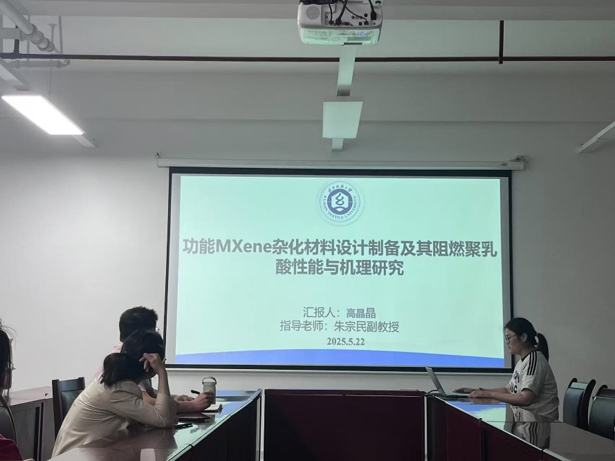 高晶晶同学汇报《功能MXene杂化材料设计制备及其阻燃聚乳酸性能与机理研究》。本研究设计制备了功能MXene杂化材料,并将其应用于聚乳酸(PLA)以提升其阻燃性能。PLA是一种可生物降解的脂肪族聚酯,具有良好的生物相容性和环境友好性,但其易燃性限制了应用范围。研究中通过引入含磷有机聚合物改性的MXene(MXene-PPD),成功增强了PLA的力学性能、结晶行为和阻燃性。实验结果表明,MXene-PPD的加入显著提高了PLA的极限氧指数(LOI)和热稳定性,降低了热释放速率(HRR)和总热释放量(THR)。通过XRD、FTIR、XPS、TG-IR等表征手段,揭示了MXene-PPD在凝聚相中形成物理屏障和在气相中释放不可燃气体的双重阻燃机制。此外,MXene-PPD与PLA基体之间的良好界面相互作用进一步提升了复合材料的力学性能。