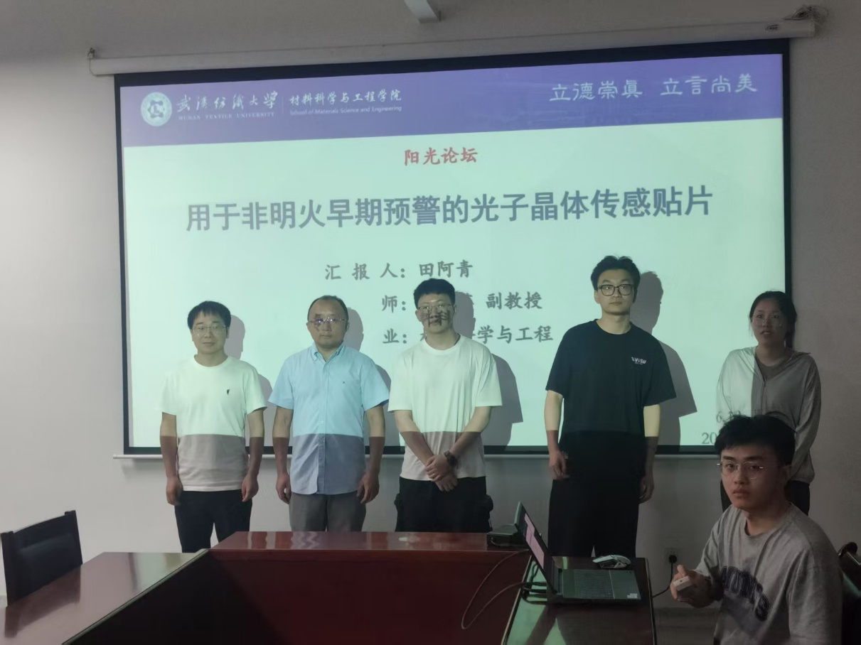 田阿青同学以《用于非明火早期预警的光子晶体传感贴片》为题进行汇报。该研究旨在解决传统火灾预警材料检测温度高、响应慢、易误报等问题,填补火灾早期预警领域的技的空白。该贴片基于光子晶体结构色原理,通过聚合物热膨胀带动晶格间距变化实现温度响应变色。实验中,研究人员成功合成三种尺寸均一的 ZnS 纳米粒子,并利用喷涂法构筑光子晶体。当温度达到 115℃时,绿色贴片可在 0.8 秒内快速变红,实现精准预警。此外,通过调节基底厚度,还可灵活控制响应时间。这一成果不仅响应速度快、预警温度低,还具备视觉直观性,为火灾早期预警提供了全新的解决方案,有望在居住场所、工业设施等场景广泛应用,为火灾防控提供有力技术支撑。