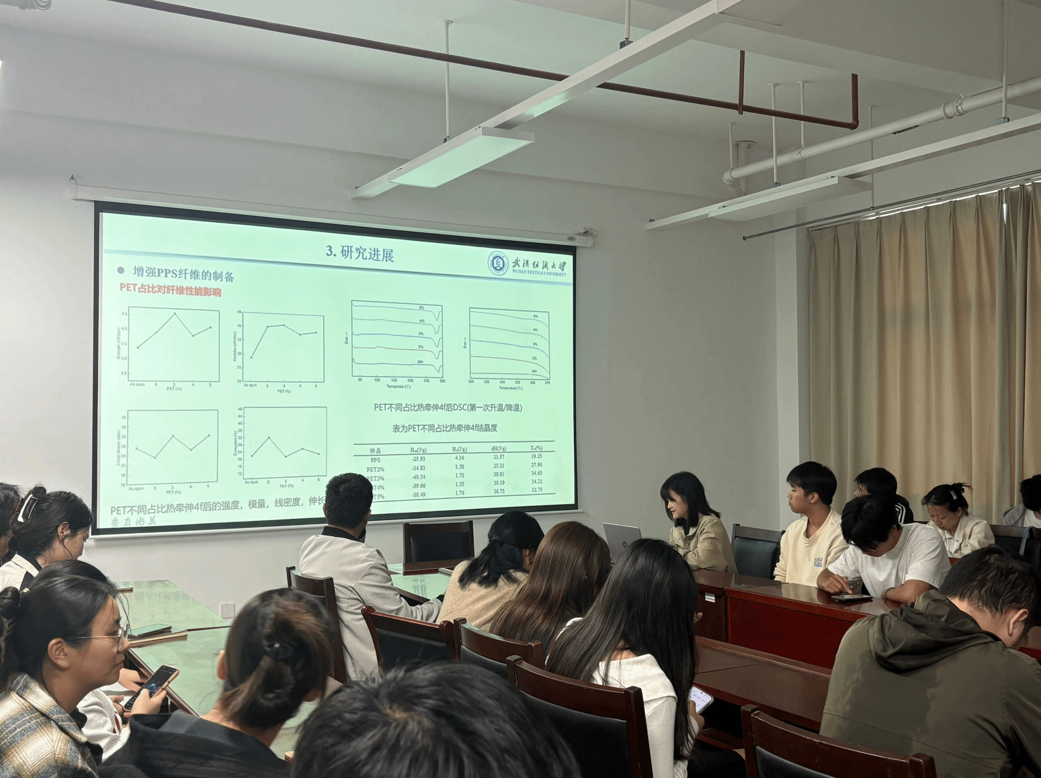 刘婉君同学以《聚苯硫醚纤维增强工艺及其应用研究》为题,针对PPS纤维强度低、韧性差的行业痛点,首次提出将聚酯(PET)微纤“原位成纤”技术引入熔融纺丝过程。通过调控PET含量(0–5 wt%)、喂料速度及热牵伸倍数,制备出拉伸强度提升42%、模量提升35%的PPS/PET微纤增强纤维。系统表征发现,3% PET、牵伸4倍时纤维结晶度最高(DSC 58.7%),SEM显示微纤直径均匀、沿轴向高度取向。进一步将增强纤维抄造成纯PPS绝缘纸,在220 °C、6 MPa热压条件下,击穿强度提升30%,且耐酸碱老化性能优异,为新能源汽车高温隔膜、绝缘防护材料提供了低成本解决方案。