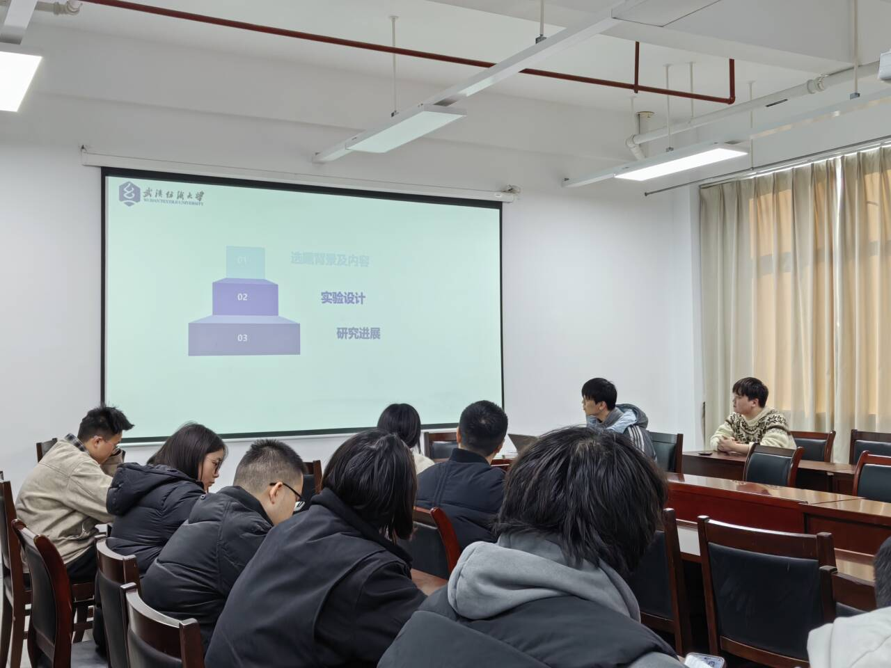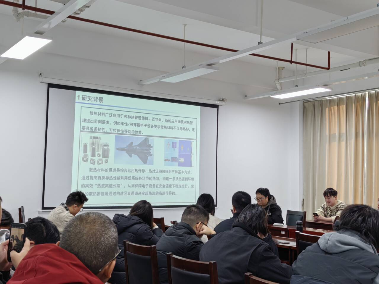 丁瑞同学汇报了《微米级静电植绒结构的构筑及其散热性能研究》。他从研究背景、基础理论、实验方法和结果分析等方面,全面介绍了静电植绒技术在构建高效散热材料中的应用。通过对比不同植绒结构的热导率和升温曲线,丁瑞同学证明了植绒结构在提高散热性能方面的显著优势。