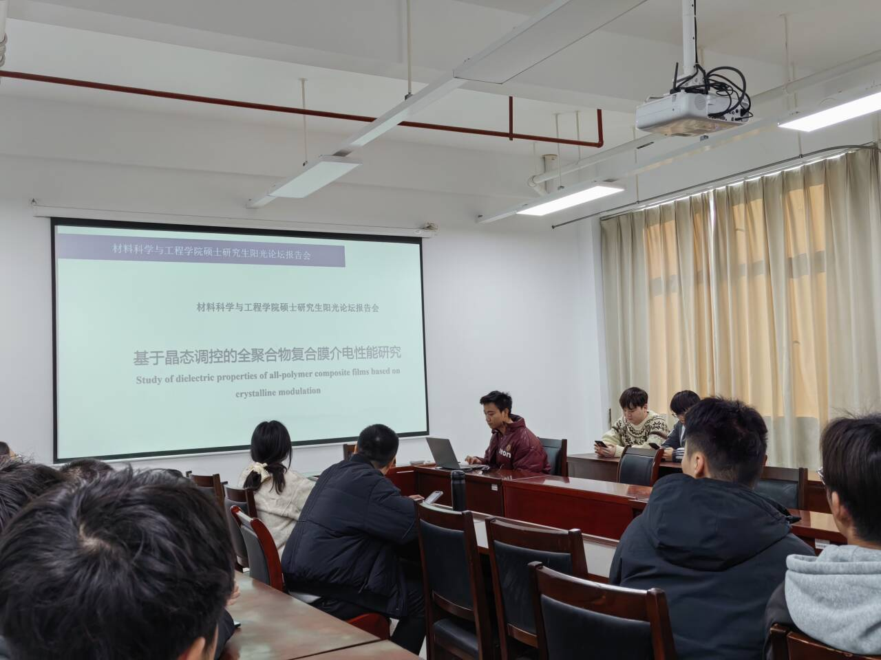 2025年11月20日,英国正版365在英国正版36512教309成功举办了2025年第25期研究生学术论坛。本次论坛由研究生院主办、英国正版365承办,杜玮、朱雨璇两位教师担任轮值主持。公司硕士研究生杨浩东、肖雨豪、丁瑞、李旭四位同学围绕“新材料的创新与应用”主题,依次汇报了最新科研进展,集中展示了公司在介电性能研究、光热转换复合材料、静电植绒结构构筑、光催化TiO2/g-C3N4异质结改性等方向的前沿探索成果。