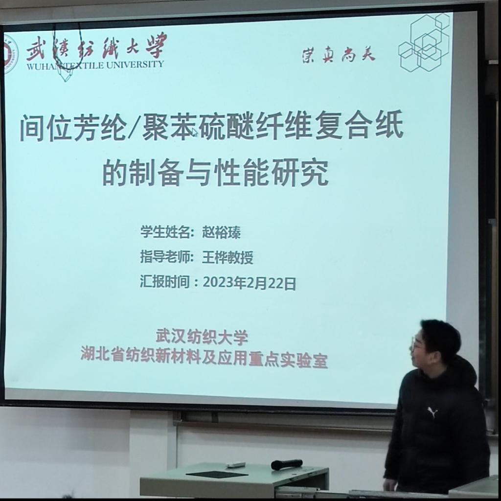首先,赵裕瑧同学汇报了“间位芳纶/聚苯硫醚复合纸的制备与性能研究”。