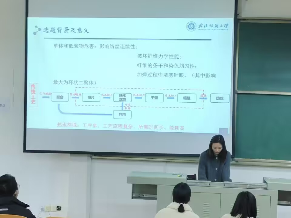首先,陶林忠同学介绍到因聚酰胺6具有耐化学品性、耐磨损性等优异性能,其便对聚酰胺6聚合熔体中单体和低聚物的高效在线脱除展开了研究。