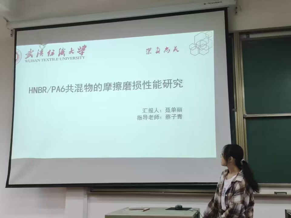 随后,聂单丽同学以“HNBR/PA6共混物的摩擦磨损性能研究”为主题。讲解到氢化丁腈(HNBR)是由丁腈橡胶通过加氢制得的一种特种橡胶,因为其具有耐油、耐高温、耐氧化、耐酸碱介质等优异性能常被应用于汽车、航空航天等领域。因此她选择了具有高强度高模量的聚酰胺作为补强填料,并对HNBR/PA6共混物的摩擦磨损性能进行了研究。得到了PA6的加入能够显著提高HNBR在室温和高温下的拉伸强度、弹性模量以及耐介质性能等结论。