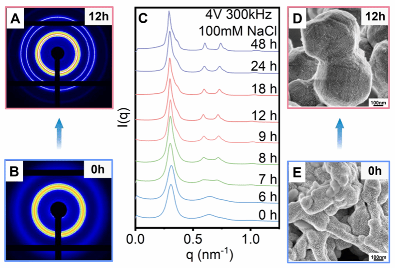 图2 电场作用不同时间,DNA-AuNPs组装结构的二维图像(A,B)和SAXS衍射图样(C)以及对应的SEM图(D,E)。