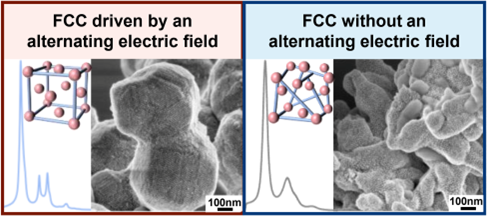 图1 施加电场与无电场条件下DNA-AuNPs组装分别形成FCC超晶格(左)和无序聚集态(右)。