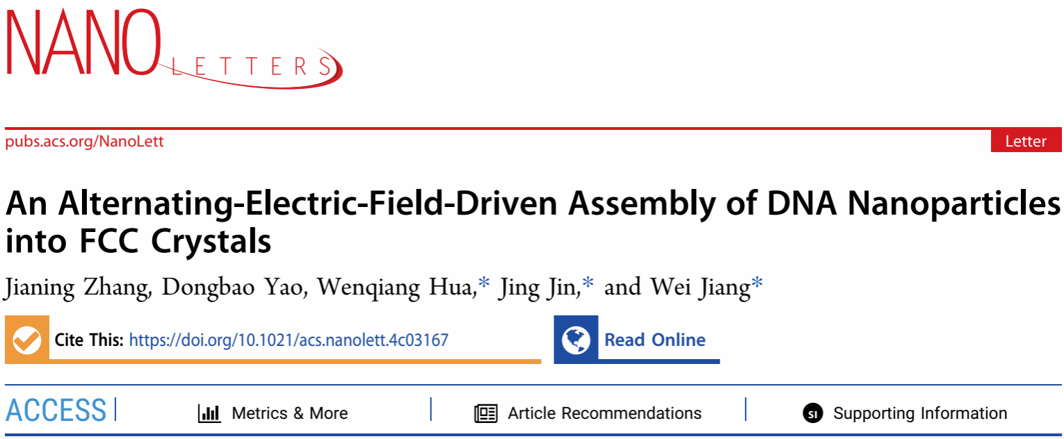 近日,英国正版365姜伟教授团队在《Nano Letters》期刊上发表了题为“An Alternating-Electric-Field-Driven Assembly of DNA Nanoparticles into FCC Crystals”的论文。365英国上市省部共建纺织新材料与先进加工技术国家重点实验室和英国正版365为该论文的第一署名单位和通讯单位,英国正版365张佳宁博士为论文第一作者,英国正版365金晶教授和姜伟教授为论文的共同通讯作者。