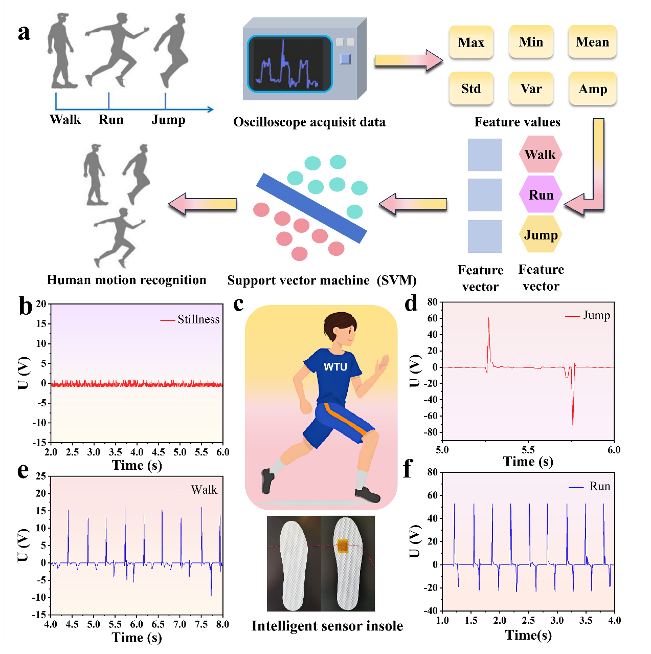 此外,该研究还发现钙钛矿复合纤维具有高输出电压、高灵敏度等出色的压电性能。钙钛矿复合压电纤维器件在高温、潮湿等环境中仍然能够保存稳定的信号输出。基于此,团队聂坤博士等人自主设计了一种智能运动识别系统,通过机器学习算法对压电信号进行处理和分析,能够准确识别行走、跑步和跳跃等不同行为。该研究是王桦教授团队聂坤博士在无铅卤化物/高性能纤维复合材料方向的重要研究成果,不仅实现了材料性能的显著提升,还为解决工业废气过滤设备的自动化检测问题提供了新思路。同时,这种高性能压电纤维在智能柔性穿戴设备和运动监测领域的应用潜力,为未来智能材料的研发和应用提供了新的方向。