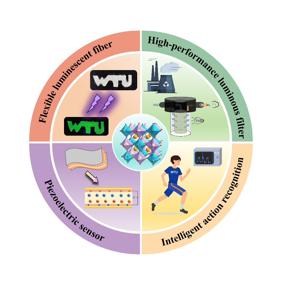 随着人们对环境友好型和高性能光电材料需求的增加,无铅双钙钛矿因其可调节的结构和显著的载流子传输效率,逐渐成为光电器件领域的热门研究对象。然而,如何开发出稳定且适用于多功能智能应用的复合材料,仍是当前面临的挑战之一。聂坤博士等通过将无铅双钙钛矿晶体与高性能纤维结合,成功制备出具有优异柔性和发光性能的功能发光纤维。该发光纤维材料以及基于该发光纤维制备的工业废气发光过滤袋在高温、低温、工业废气等多种使用环境中展现出良好的发光稳定性和结构稳定性。