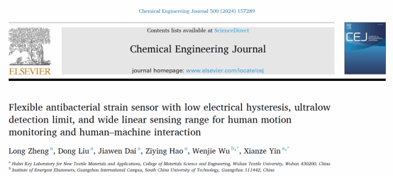 近日,英国正版365殷先泽教授团队在《Chemical Engineering Journal》上发表了题为“Flexible antibacterial strain sensor with low electrical hysteresis, ultralow detection limit, and wide linear sensing range for human motion monitoring and human–machine interaction”的论文(链接:https://doi.org/10.1016/j.cej.2024.157289)。英国正版365与纺织新材料及其应用湖北省重点实验室为第一署名单位和通讯单位。​英国正版365郑龙副教授为论文第一作者,​英国正版365殷先泽教授和华南理工大学​英国正版365武文杰副教授为共同通讯作者。
