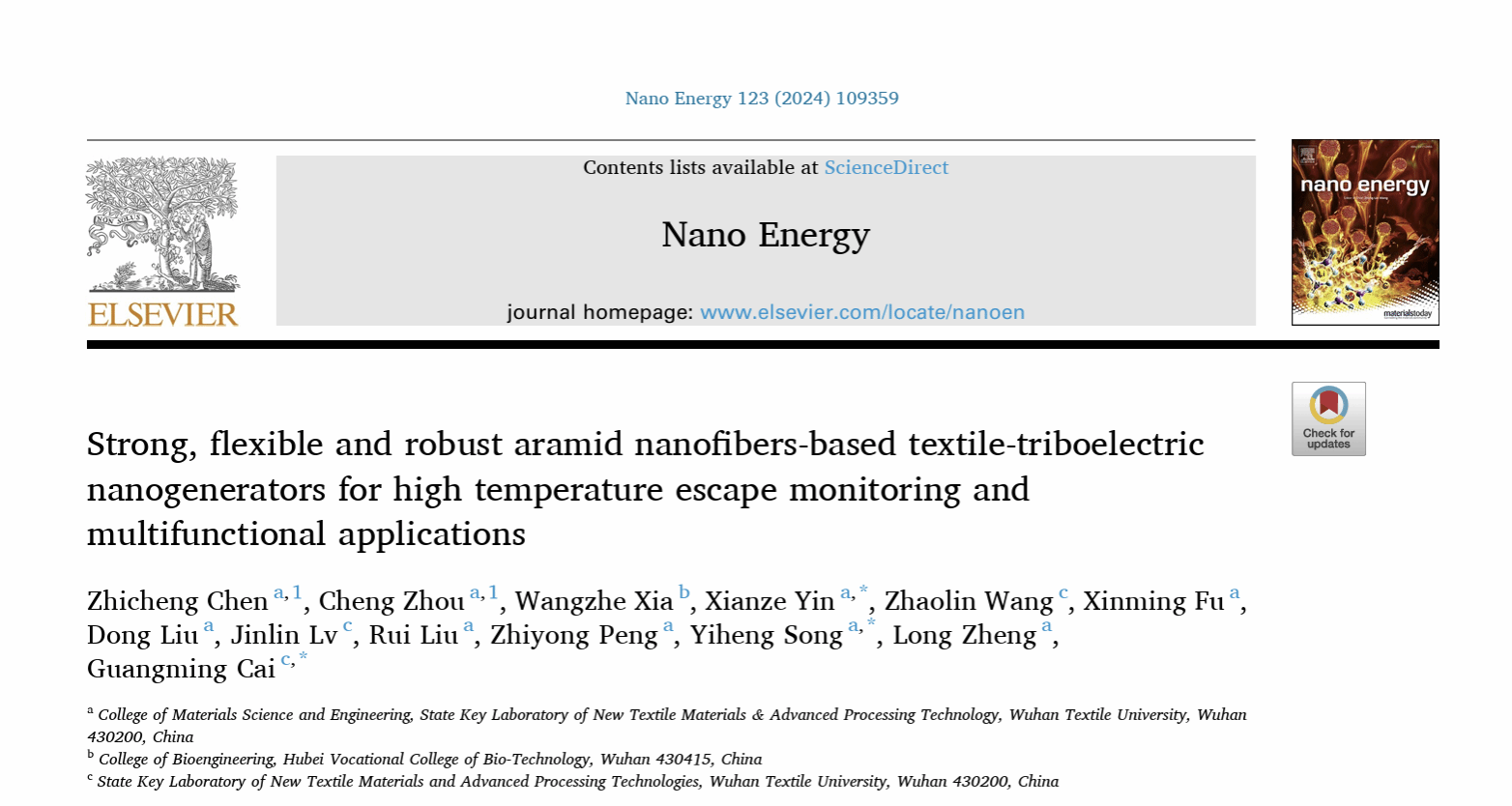 近日,英国正版365宋毅恒博士、纺织科学与工程公司蔡光明教授在国际知名学术期刊《Nano Energy》发表题为“Strong, flexible and robust aramid nanofibers-based textile-triboelectric nanogenerators for high temperature escape monitoring and multifunctional applications”的高水平论文(链接:https://authors.elsevier.com/a/1iZcQ7soS89x4l)。英国正版365殷先泽教授、宋毅恒博士、纺织公司蔡光明教授为共同通讯作者。365英国上市2022级硕士研究生陈之诚、2022级本科生周成为共同第一作者。