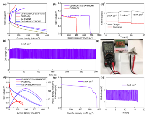 氧还原反应(ORR)是燃料电池和金属空气电池阴极反应,ORR催化剂活性对电池放电性能起决定性作用。然而由于ORR是4e-反应,动力学缓慢,且容易通过2e-反应形成H2O2,造成对催化剂的腐蚀。前期研究结果表明,单原子Co催化剂(Co-SA)能够遵循2e-的ORR反应生成H2O2,金属钴催化剂能够高效的对H2O2进行进一步的还原。基于此,论文通过在制备氮掺杂碳纳米管限域钴催化剂的过程中添加ZIF-67,构筑Co-SA/Co-NP接力催化剂。电化学测试和理论计算结果表明,Co-SA的存在能够高效的实现H2O2中间体的产生,并且在Co-NP的作用下,进一步还原成H2O,遵循O2-H2O2-H2O的反应机理。同时Co-SA的引入,其ORR催化活性提高18倍。此外,催化剂的大电流析氧反应(OER)活性同样得到提高,主要归因于ZIF-67的添加形成微米管,降低传质阻抗。组装的锌空气电池测试发现,其最大功率密度为155 mW cm-2,是商业化催化剂的2倍,并且循环300小时,电池性能无明显衰减。组装的全固态锌空电池最大功率密度高达120 mW cm-2,表明其在可穿戴设备上的应用前景。