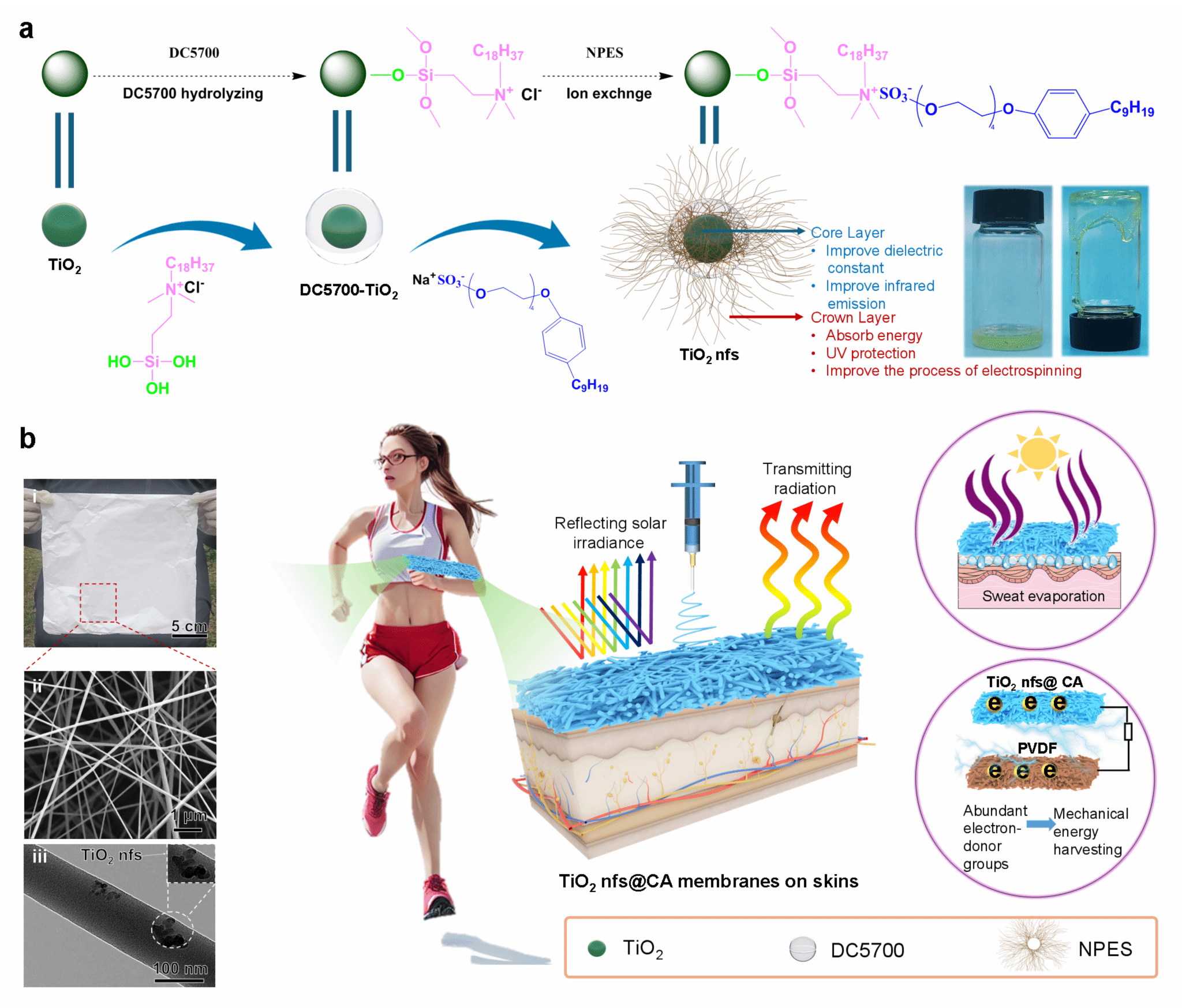 近日,英国正版365殷先泽教授团队,与英国正版365杨诗文副教授及佛山市第二人民医院文先杰教授合作,在《Nano Energy》上发表了题为“Phase transformation enabled textile triboelectric nanogenerators for wearable energy harvesting and personal thermoregulation”的论文。英国正版365和先进纺纱织造及清洁生产国家地方联合工程实验室为第一单位。英国正版365研究生陈之诚、徐梅为共同第一作者。该论文详细分析了二氧化钛无溶剂纳米类流体(TiO2 nfs)在织物型摩擦电纳米发电机(t-TENGs)的应用,报道了二氧化钛无溶剂纳米类流体在人体温范围内迷人的相变吸热特性及其在机电转化中面向生命健康传感的应用(图1)。