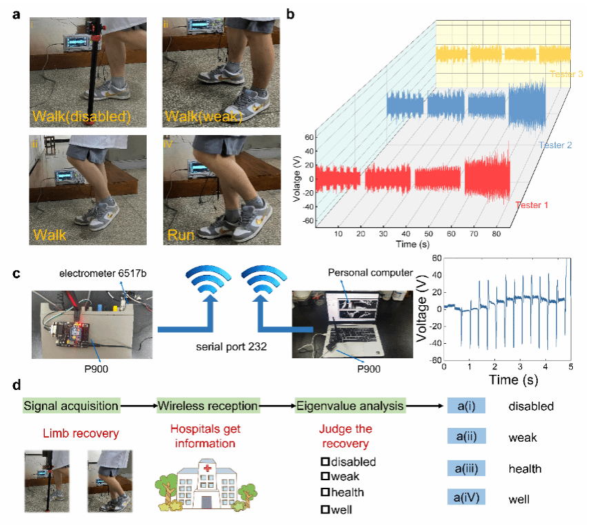 在机电转化方面, TiO2 nfs显著提高了材料的抗紫外线性能、力学性能和介电性能,同时提高了基于摩擦电的机电转化能力。TiO2 nfs@CA t-TENGs在能量收集能力和压力传感能力方面表现出优越的功能性。通过支持向量机与无线传感技术(准确率达97%),可用于实现实时分辨运动类型,包括足部运动分析以及人体健康维护目的恢复评估。通过深度学习,实现了远程监测肢体受伤者足部回复情况。总的来说,这种还兼具亲肤性、可染性和可回收特性的TiO2 nfs@CA t-TENGs为舒适的自供电可穿戴设备提供了一种新方法,以实现实际的足部运动预测和健康监测。