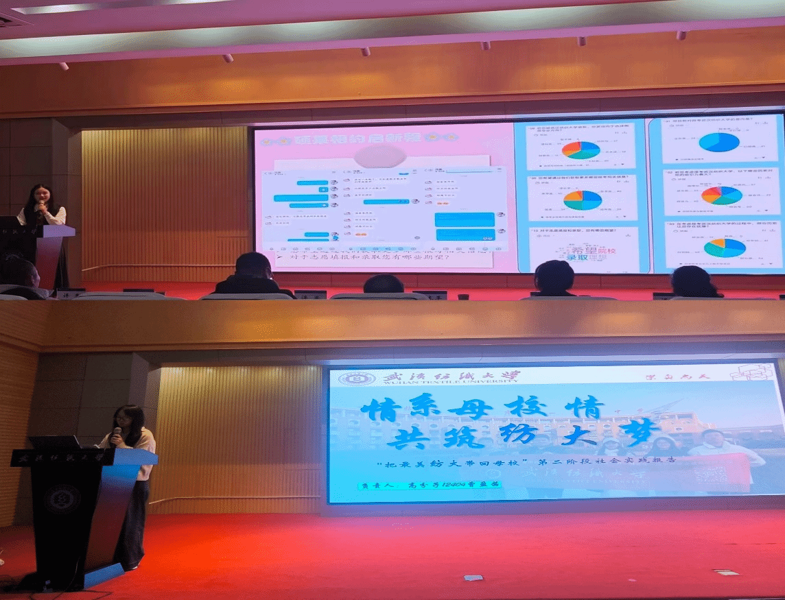 答辩会上,公司参赛团队通过实物展示、视频回顾、PPT讲解等方式,结合自身求学经历,从校园环境、团队建设、文化活动等方面展开讲述,展示了精彩的实践经历。在实践中,同学们开展了“纺大故事分享”、“专业特色解读”、“互动答疑交流”等活动,生动诠释了“崇真尚美”的校训精神,分享了团队在实践过程中的感悟与收获。