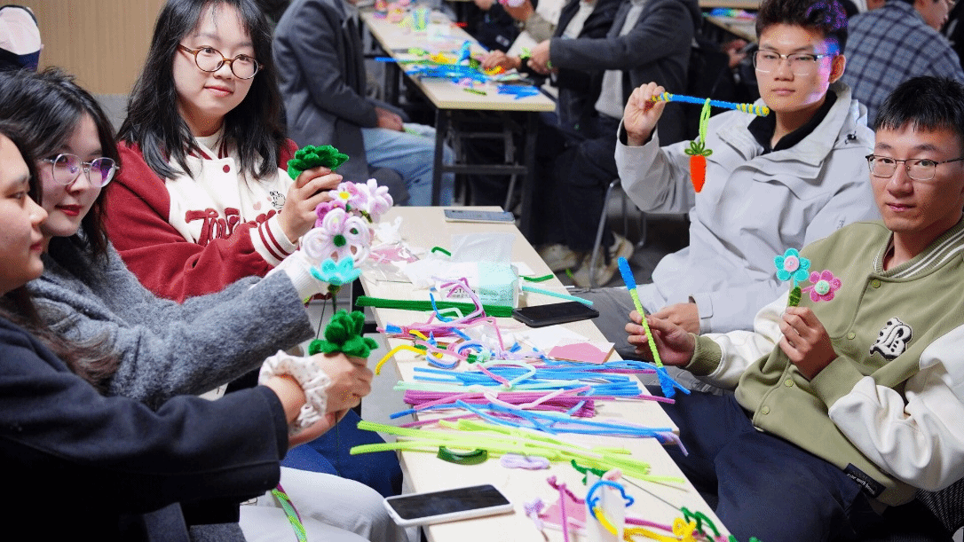 同学们在轻柔的音乐中学习制作扭扭花,从扭棒塑形到组合成花,大家在专注中放松心情,享受创造的乐趣。活动现场气氛轻松,笑声不断,一朵朵独具个性的扭扭花在指尖绽放。随后进入“情绪漂流”环节。参与者匿名在“花语卡”上写下自己的烦恼或压力,将卡片系在自制扭扭花上,投入“花海”中。接着,每人随机抽取一支他人的“烦恼花”,阅读卡片内容后,在“回馈卡”上写下温暖鼓励的话语。这一过程不仅实现了情绪的匿名释放,更在陌生人之间搭建起一座情感支持的桥梁。