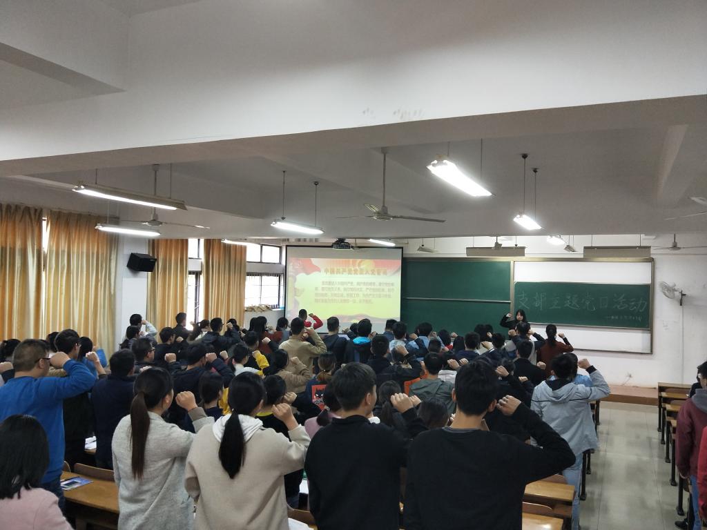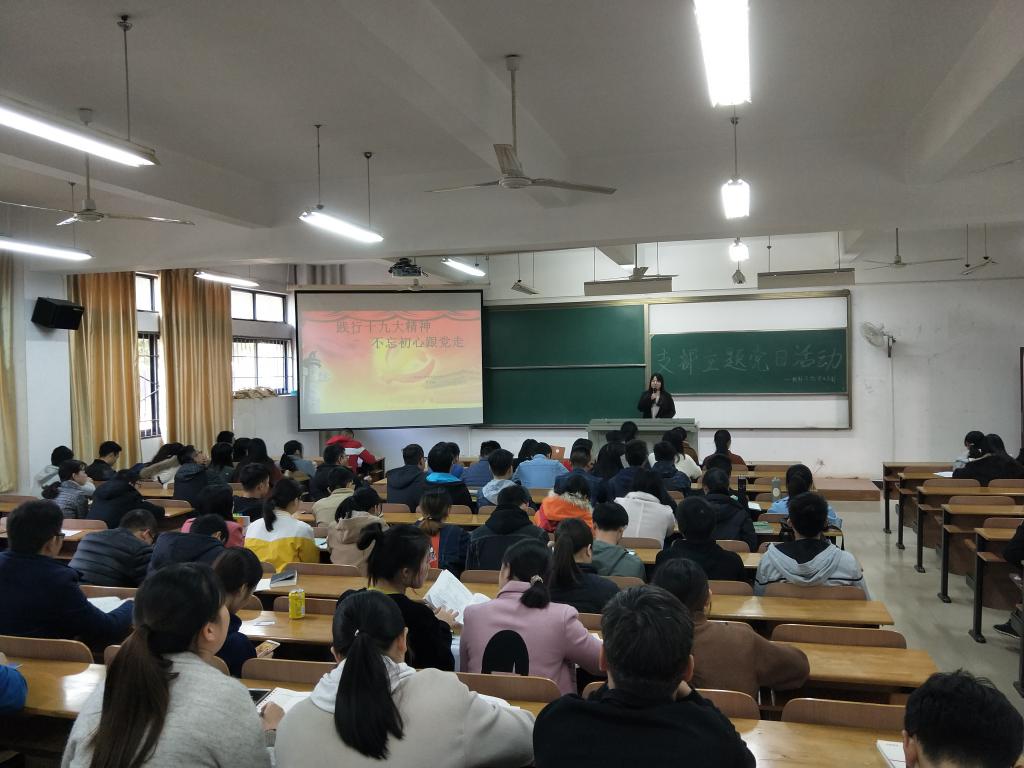 为深入贯彻学习党的十九大精神,英国正版365员工二支部书记黄鹤于2017年11月26日下午2:00,在8号教学楼T110教室开展了“践行党的十九大精神,不忘初心跟党走”为主题的党课报告。