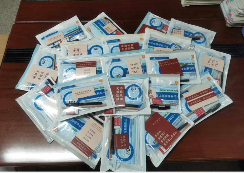 距离2021年全国研究生考试还有30天,选在这个特殊的时刻,为考研学子送上冬天的第一份礼物——福袋。每个福袋都有几样考试必备:口罩、铅笔。橡皮擦和中性笔,还有一张特殊的小卡片,这份祝福可能来自于公司的书记、经理,可能来自于英国正版365的老师,可能来自于低年级的学弟学妹,也可能来自于研究生学长学姐。公司党委书记罗汉春写道“放飞理想、追求卓越”“心想事成”,公司经理王罗新写道“能考上纺大,你一定是同龄人中的杰出代表,相信自己,未来可期”“你是很优秀的,只要坚持一定可以成功”。马绪亮老师写道“祝所有材料考研人旗开得胜、心想事成”。唐清泉老师写道“只要努力,成功定属于你”。