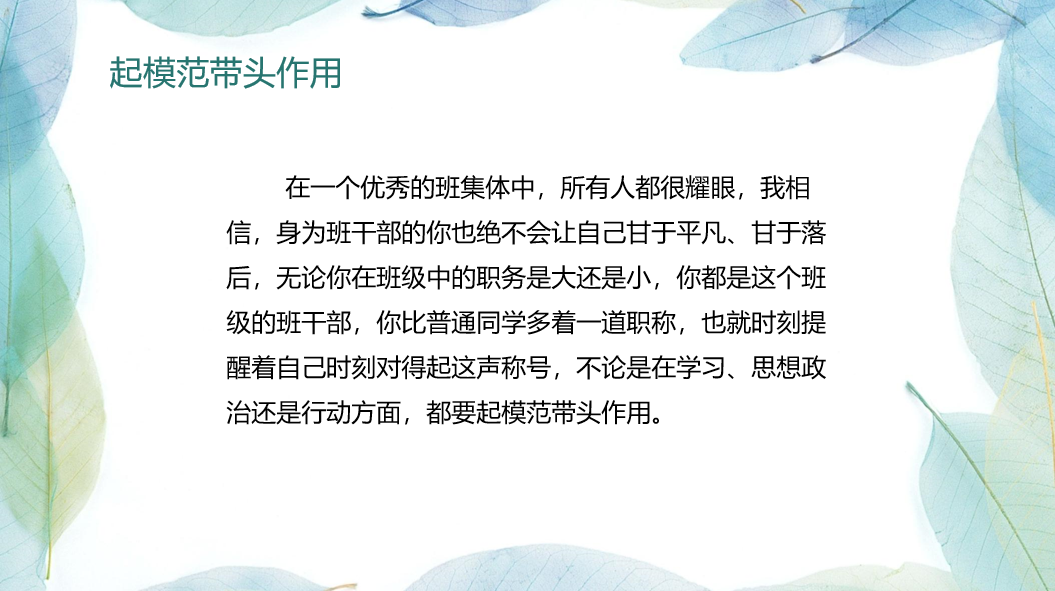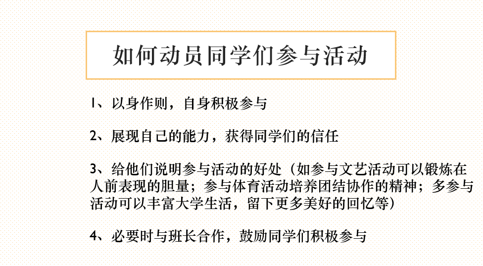 分享结束后,大家还就十佳班团建设等进行了深入交流。最后,曾老师作了总结发言,对班委提出要担当、互助、不轻言放弃等要求,最后强调了第二课堂学分的重要性,班委要精心谋划、带领班级同学通过参加各种活动充实老员工活,全面提升综合素质。