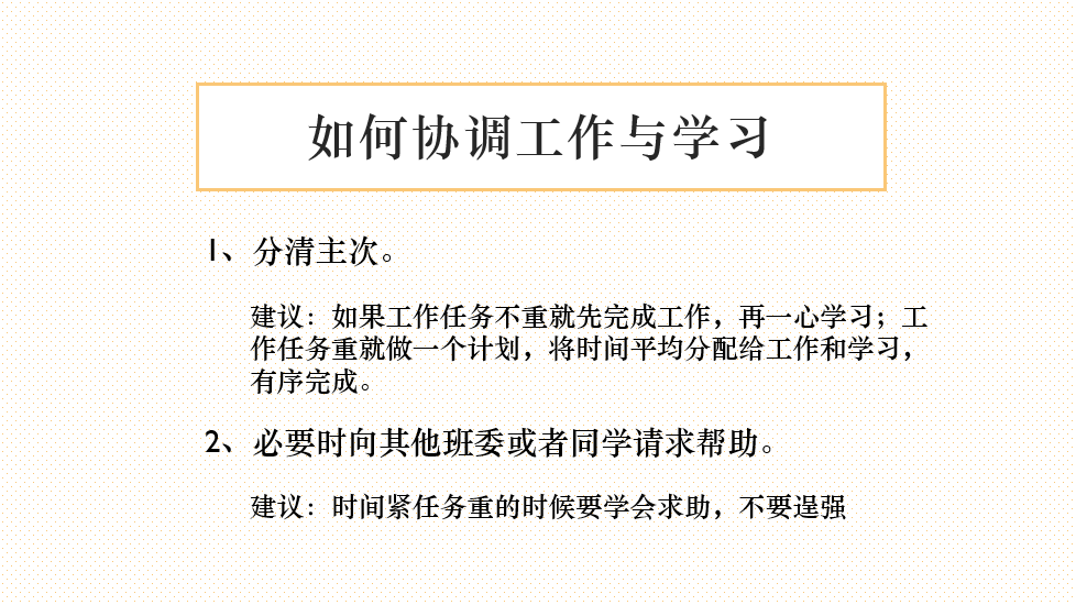 会上,毛老师介绍了召开本次会议的初心——不同年级、不同班级之间的班委进行班级工作中的经验交流和分享,可以帮助班委博采众长,提高班级工作时的效率,事半功倍;同时交流如何协调班委工作和个人学习,还可以帮助班委个人综合素质得到提高。毛老师表示这次交流会只是一个开始,后面还会举办考研交流会、科研竞赛交流会等,开阔班委工作的视野和格局,切实助力班级建设。