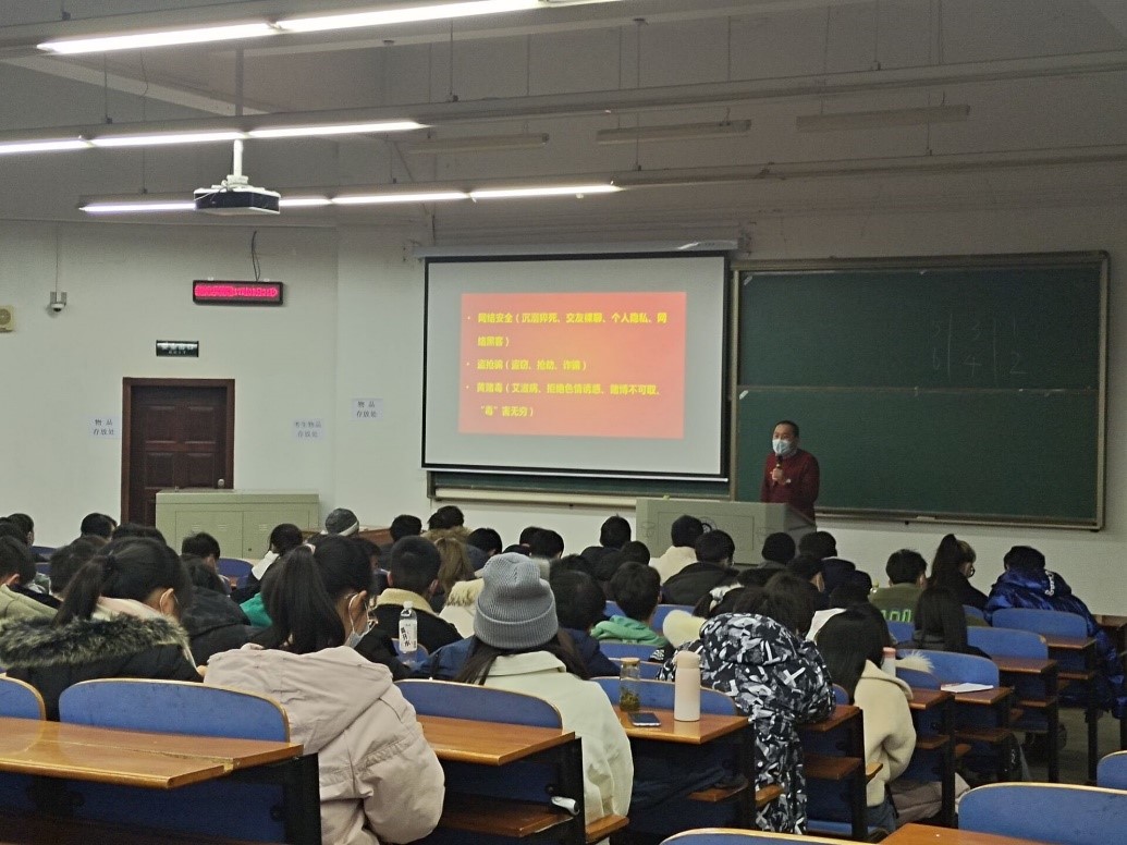 毛老师从“火灾”“溺水”“交通”“网络”“盗骗抢”“黄赌毒”“人身伤害”“电信诈骗”“传销和校园贷”“暴恐间谍和邪教”“中毒和疾病”“心理疾病”“实习安全”“自然灾害”等14个方面进行了安全隐患的讲解,并结合近期新闻媒体报道的安全事件作了分析。