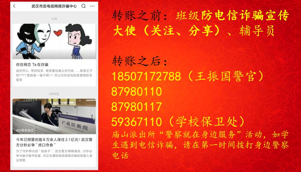 会上,毛老师还为同学们提供了日常生活中遇到转账问题时的解决方案:转账之前,找班级防电信诈骗宣传大使或辅导员甄别对方身份,谨防上当受骗;转账之后(受骗发生之后),第一时间联系庙山派出所王警官电话18507172788、庙山派出所电话87980110、87980117,及时止损;校园生活中遇到不良推销或其他安全事件,则第一时间联系公司保卫处电话59367110。竞赛活动的试题及答案也第一时间通过班委发到各班级群中,让所有同学都可以掌握正确答案,采取正确的处置方式。