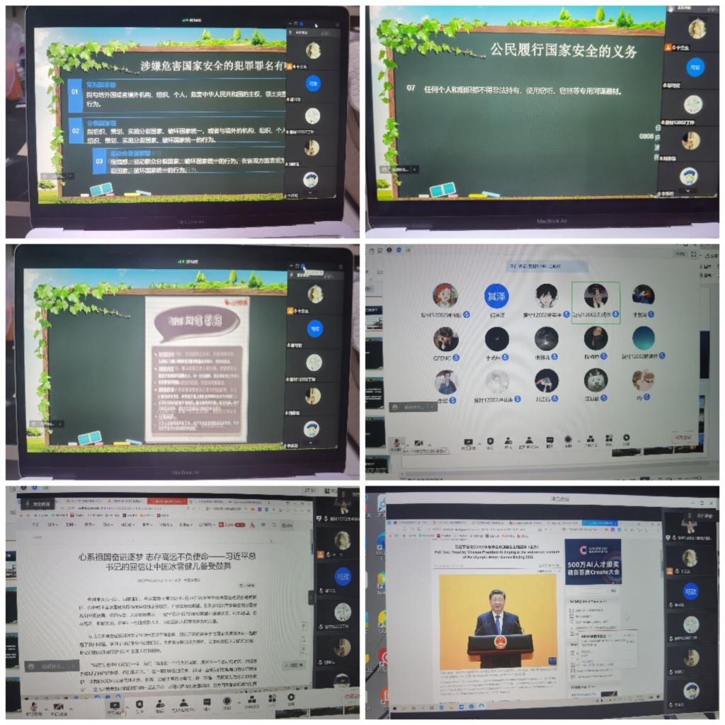各班级主题班会由班长主持,从什么是国家安全、危害国家安全的行为及相关罪名、公民如何维护国家安全、谁来保卫国家安全、公民维护国家安全要注意什么等几个方面展开。主题班会既有案例分析,具体分析了哪些是危害国家安全的行为;又有法律条文解读,介绍了涉嫌危害国家安全的罪名;还普及了公民在国家安全问题上的权利和责任义务是什么,遇到危害国家安全的行为可以直接拨打12339举报电话等。