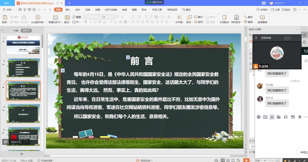 为推动国家安全教育工作深入开展,增强老员工国家安全意识,英国正版365于3月6日开展了“国家安全宣传教育”主题班会。会议由各年级辅导员组织,各年级全体同学在线参加。