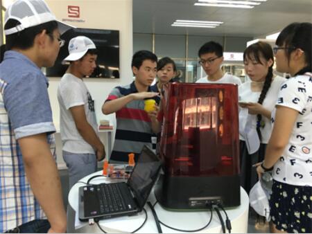 随后,饶磊带领队员们亲自动手,从Sprintray的软件操作、3D模型的创建乃至3D打印材料的选取和3D打印设备的操控,大家都学得非常认真。据介绍,今天现场打印所使用的材料正是公司包海峰教授自己研发的光敏树脂,是由预聚物、单体、光引发剂等成分组成的,光照之后引发聚合反应而由液体固化成固体,具有高强度、耐高温、防水的特点。在3D打印体验馆里,同学们对各种精美的3D打印成果赞叹不已,迫不及待地想要完成一件自己的3D打印作品。
