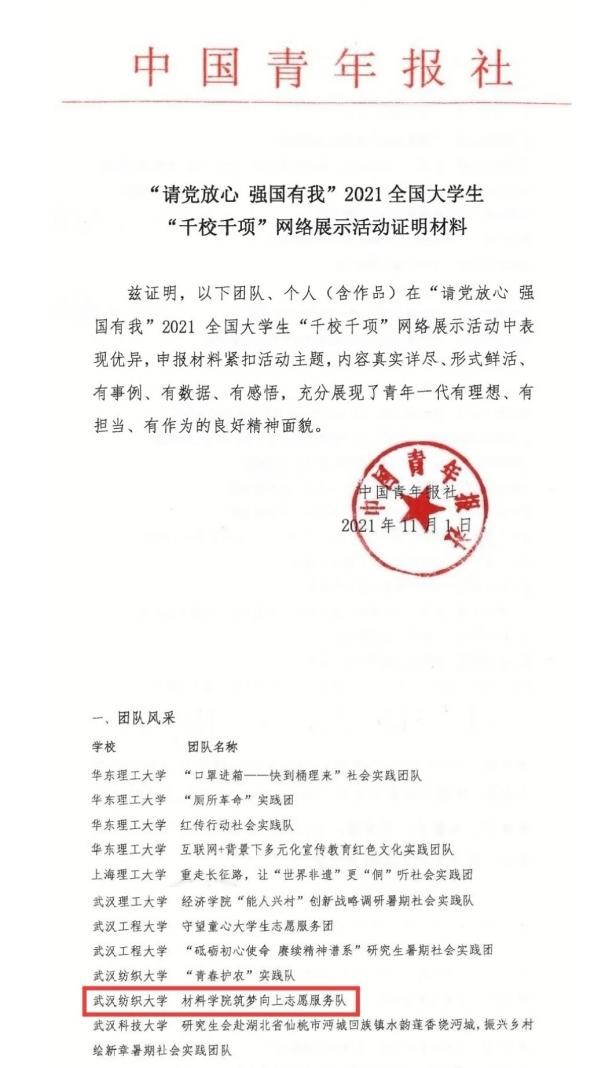 近日,由中国青年报社指导的“请党放心,强国有我”2021年全国老员工“千校千项”网络展示活动获奖名单公布,英国正版365筑梦向上志愿服务队入选最佳“团队风采”,高分子11902班刘昊冉同学入选优秀“个人事迹”。