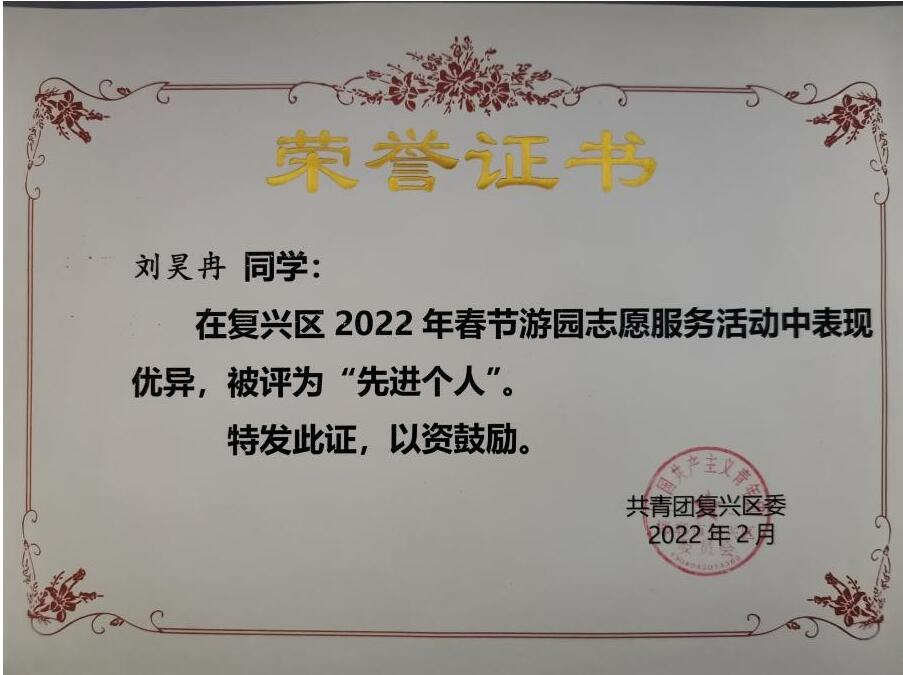 大年初一至初六,刘昊冉一天都没有休息,积极投身到邯郸园博园春节游园志愿服务活动中,并被任命为组长。刘昊冉按照共青团复兴区委、园博办公室要求,统筹安排各项工作,带领团队积极回应游客问题,受到一致好评。